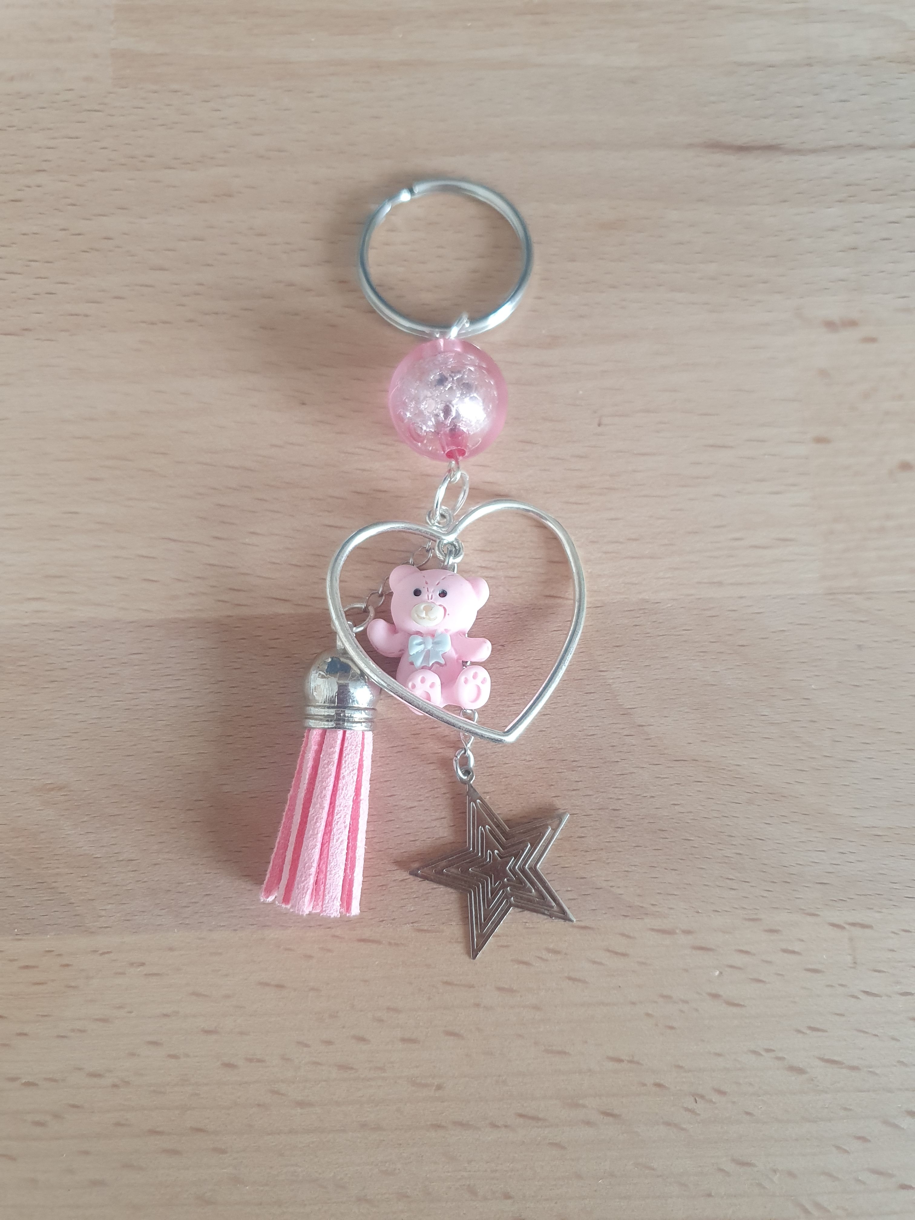 Composé d'une charmante breloque en forme de coeur, d'un petit ours trop craquant, d'un pompon suédine et d'une jolie étoile, il saura vous séduire à coup sûr.