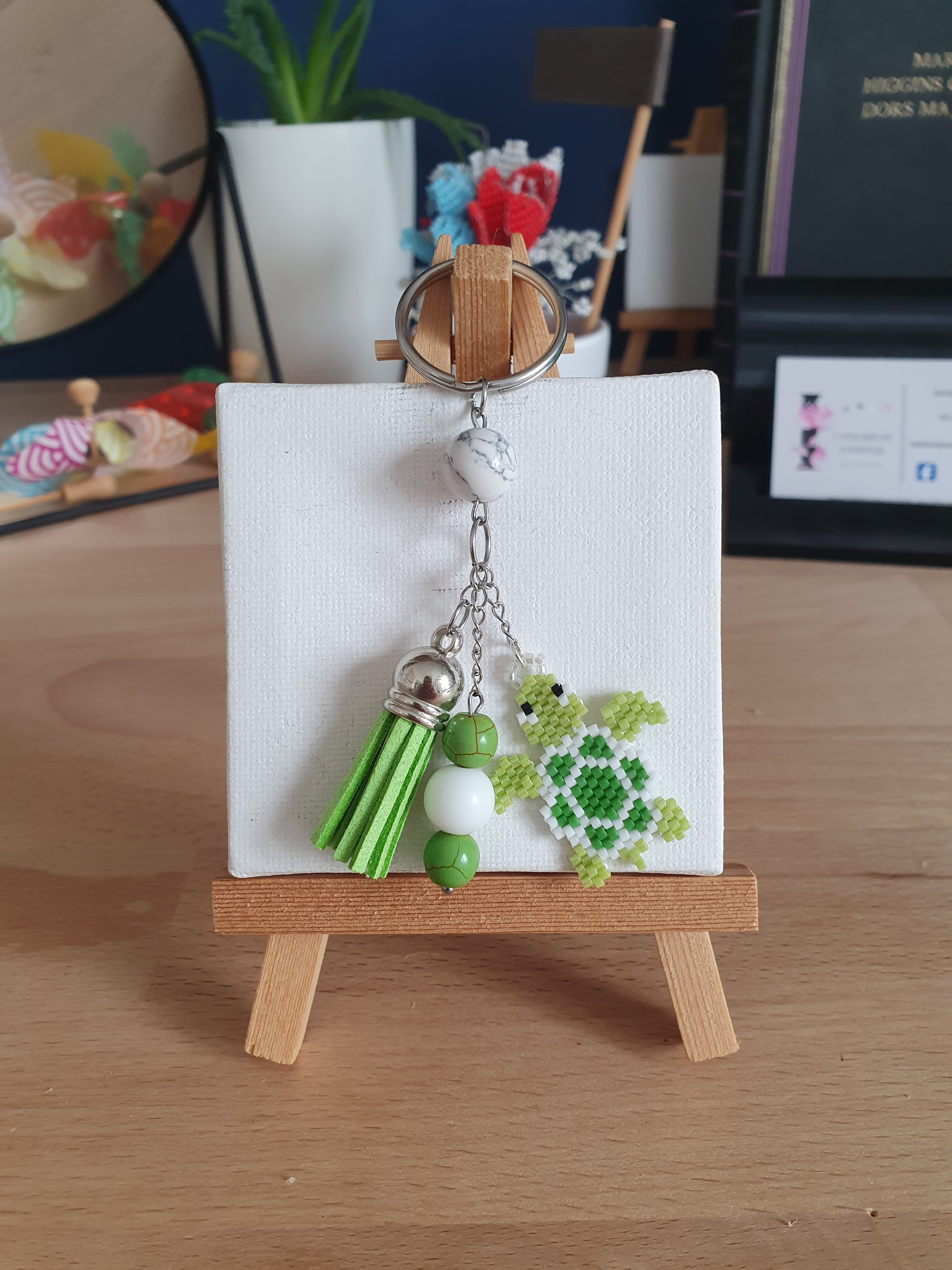 Ajoutez une touche de charme et d'originalité avec ce magnifique bijou de sac composé de perles, d'un pompon et d'une petite tortue verte tissé à la main avec des perles miyuki.