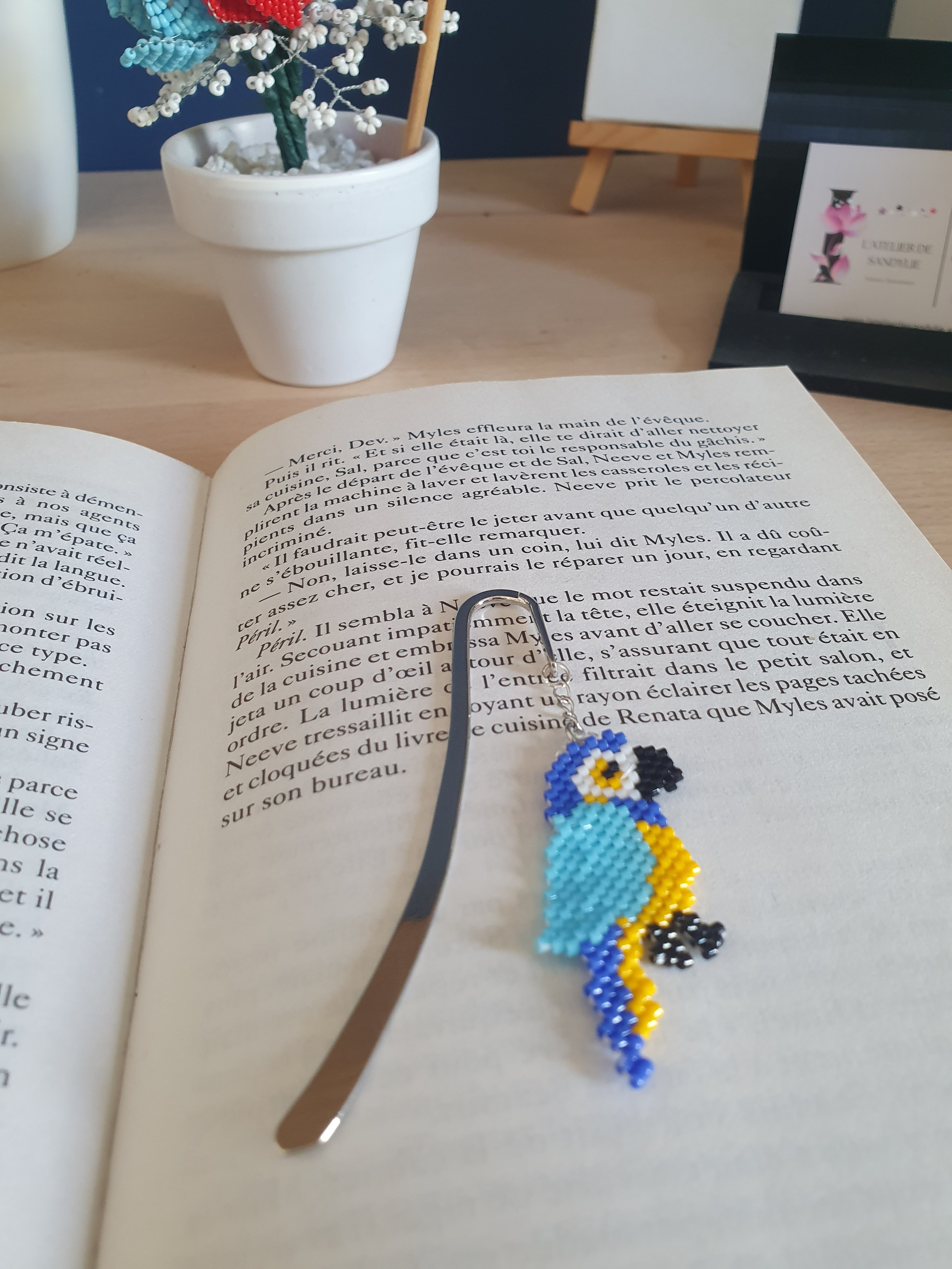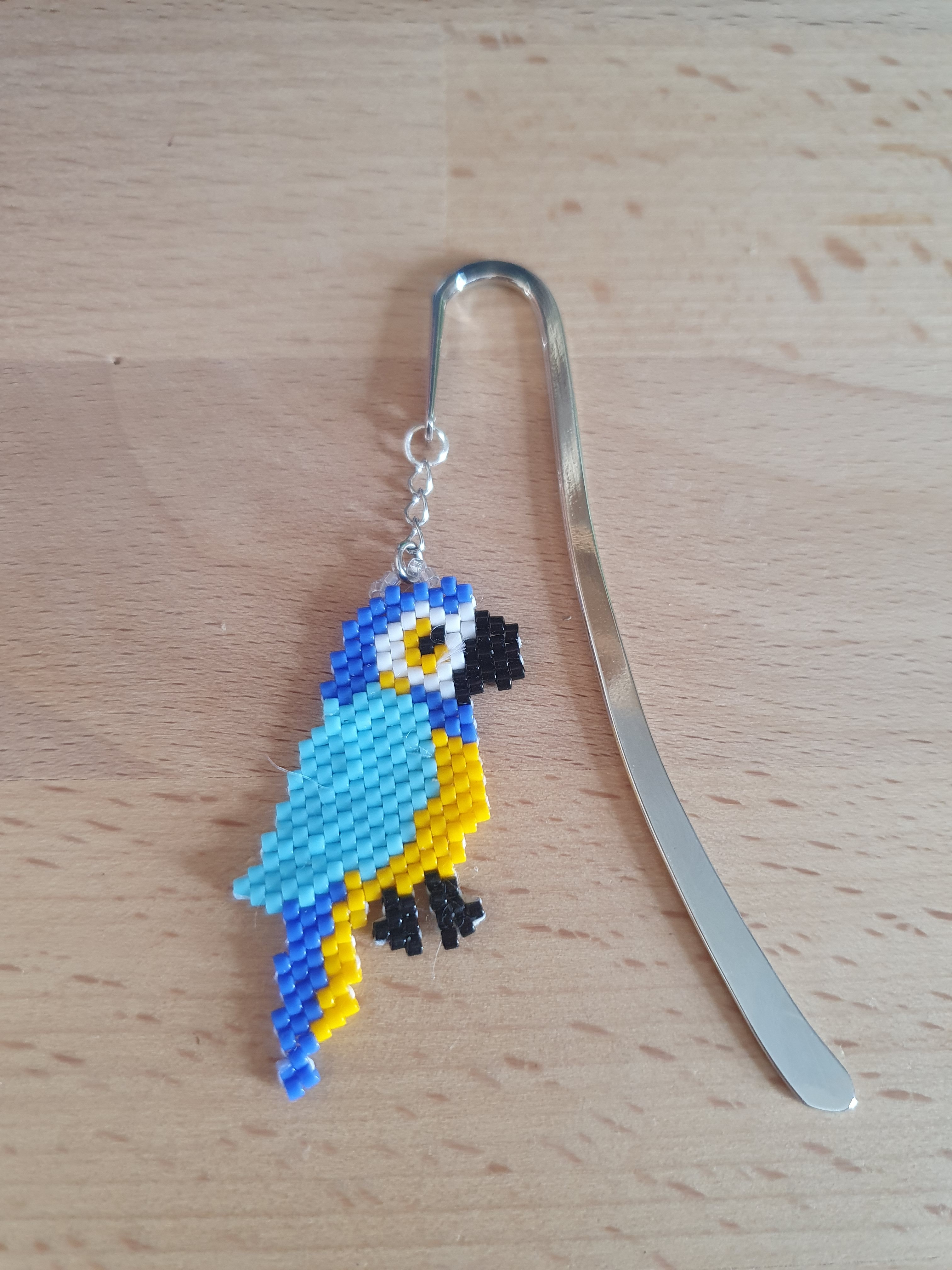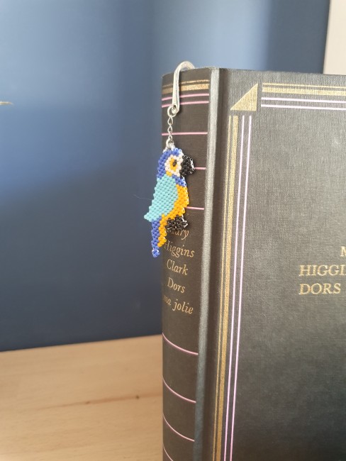 Un magnifique perroquet aux couleurs vives et tropicales, tissé à la main avec des perles Miyuki et monté sur un marque page accompagnera toutes tes lectures.