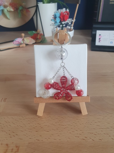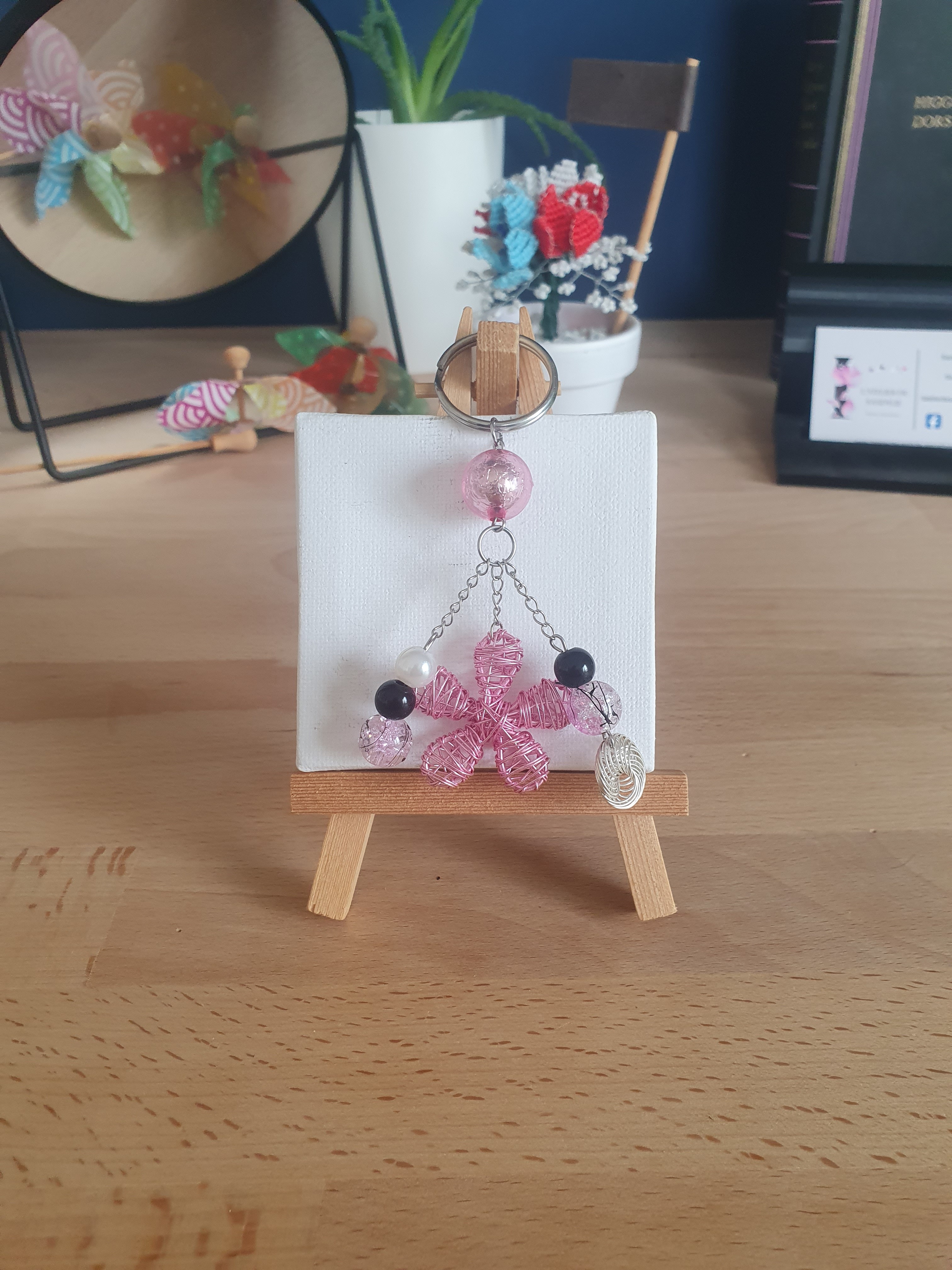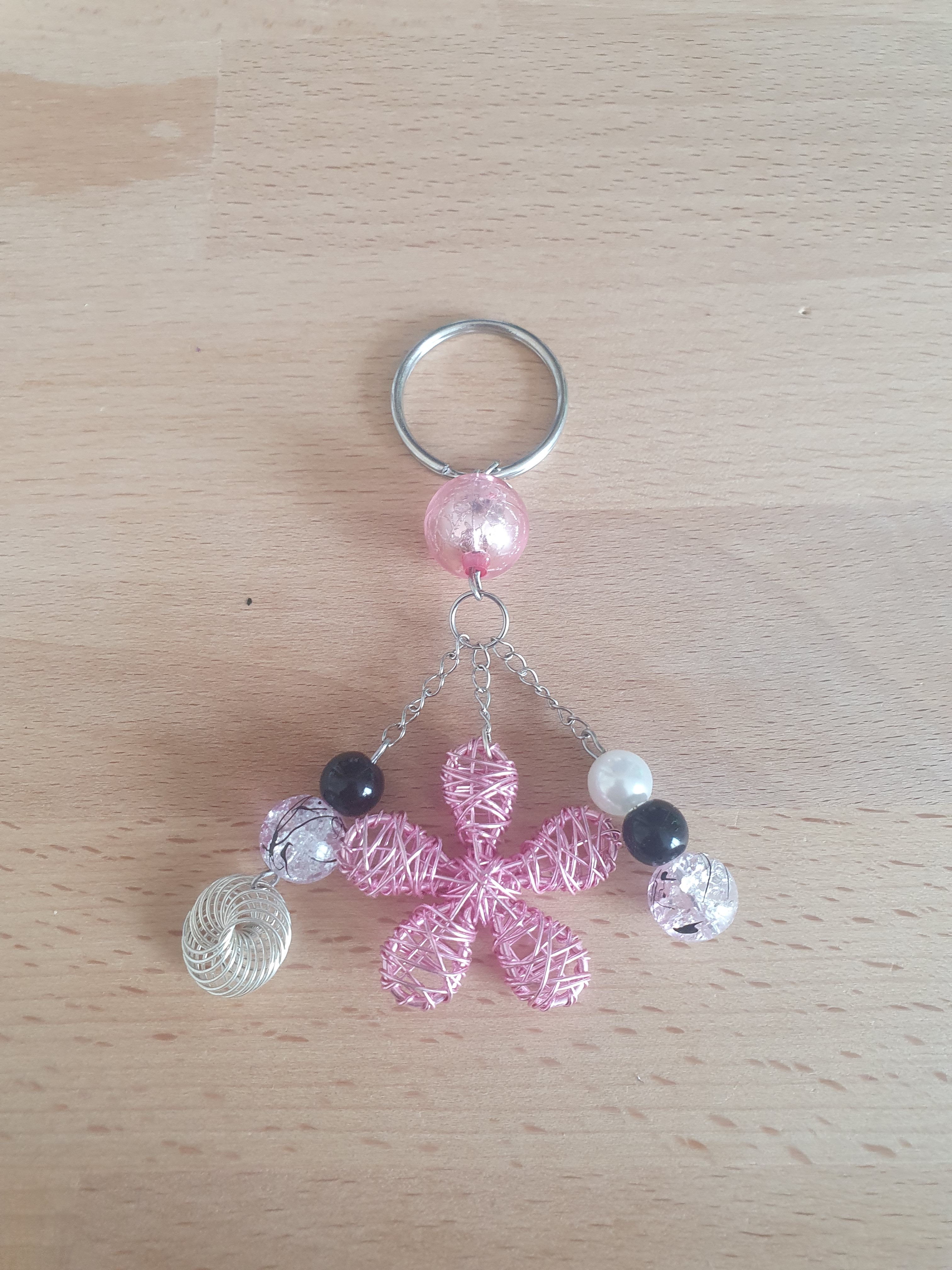 Composé de perles délicates et d'une fleur en fil alu, ce porte clé apportera à votre sac à main une note raffinée et originale.